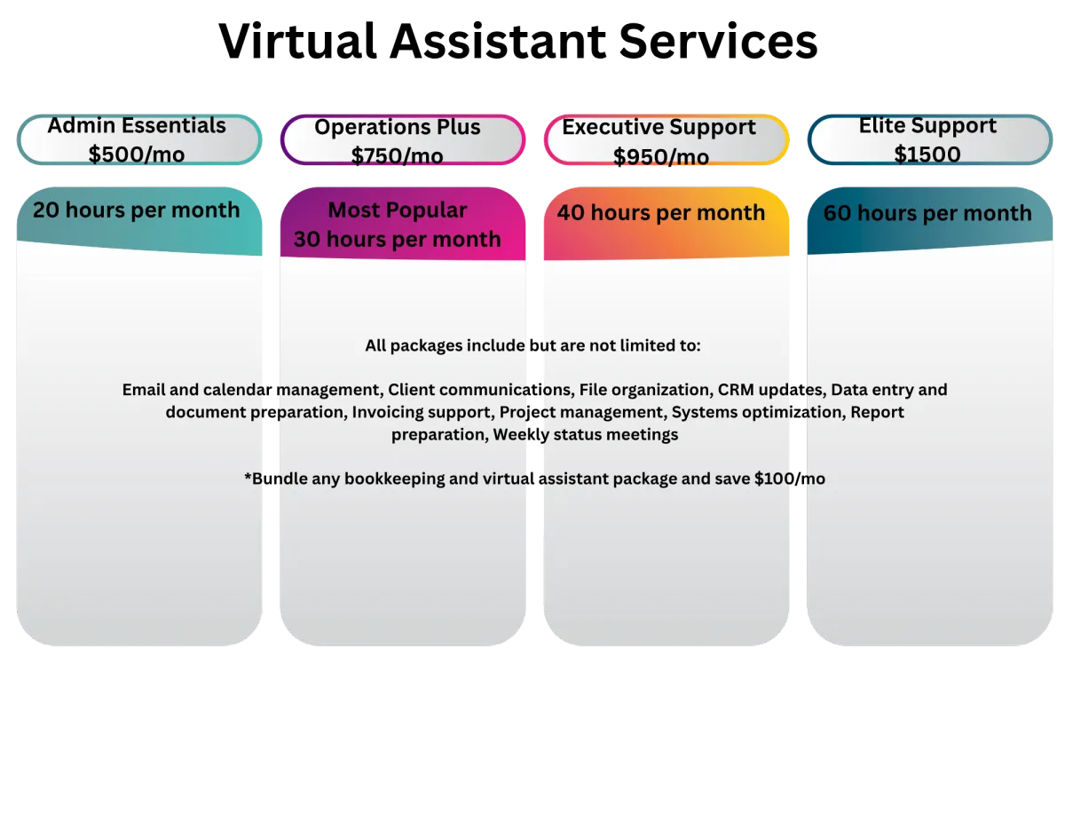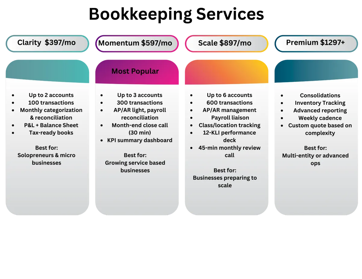 Add-ons: Bill pay $200+, Invoicing $200+, Expedited close $150, Additional entity $250+, Cleanup: $3000+, Quickbooks Setup $1000